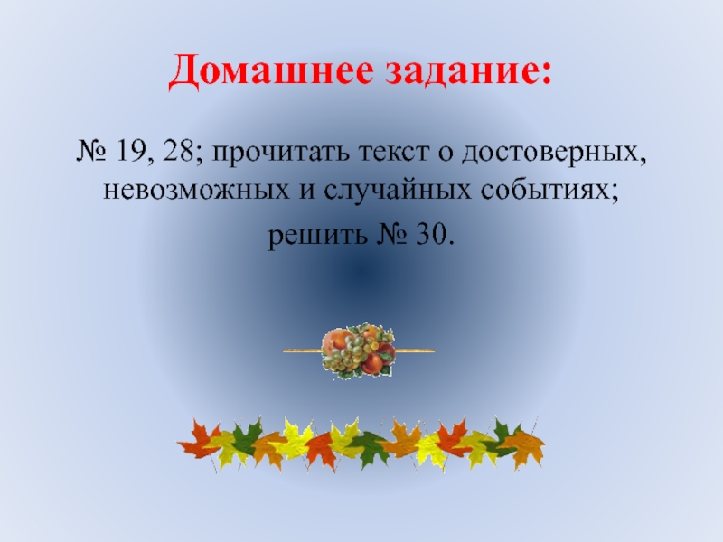 № 19, 28; прочитать текст о достоверных, невозможных и случайных