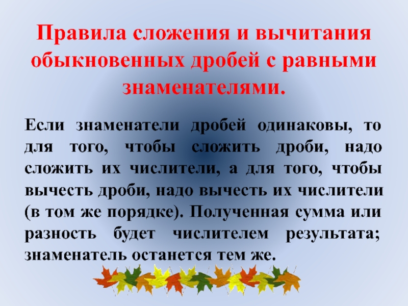 Слайд 11Правила сложения и вычитания обыкновенных дробей с равными знаменателями.