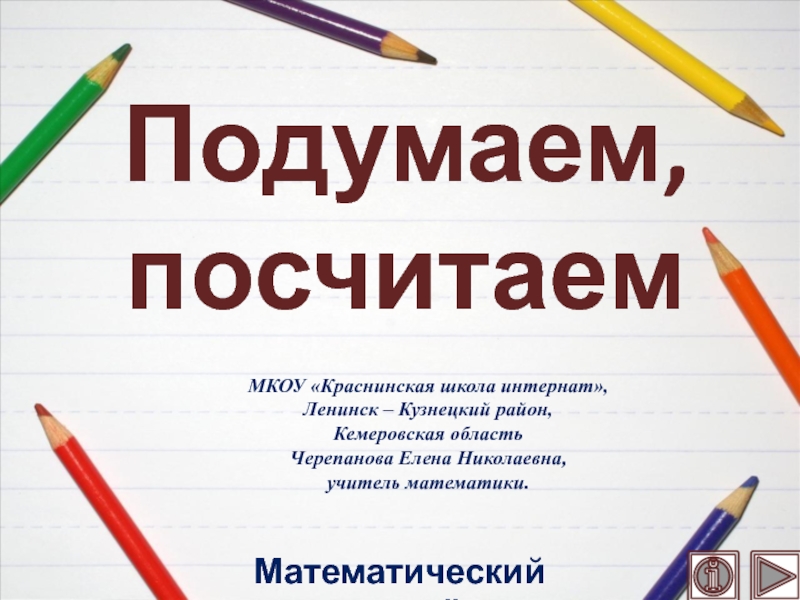 Подумаем, посчитаемМатематический тренажёрМКОУ «Краснинская школа интернат»,Ленинск – Кузнецкий район,Кемеровская областьЧерепанова Елена Николаевна,учитель математики.