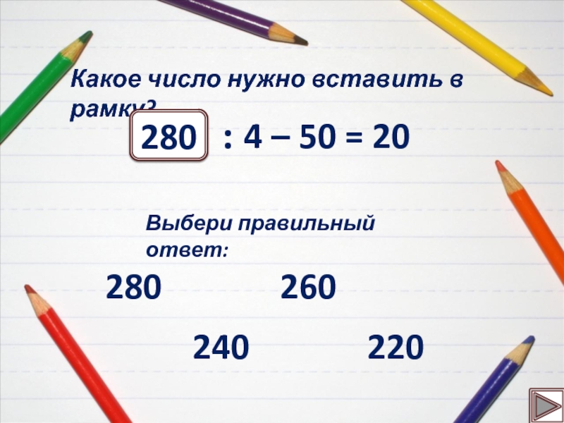 : 4 – 50 = 20 Какое число нужно вставить в рамку?280