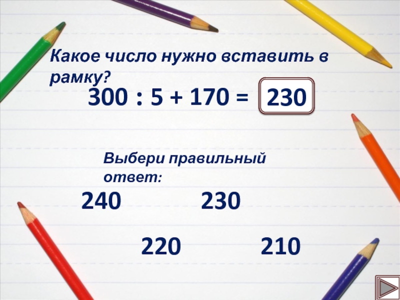 300 : 5 + 170 = Какое число нужно вставить в рамку?230