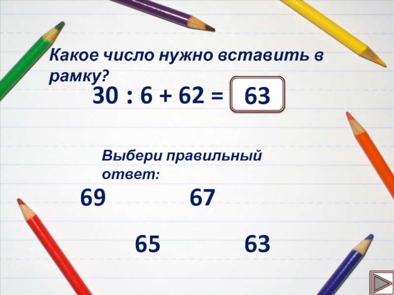 30 : 6 + 62 = Какое число нужно вставить в рамку?63