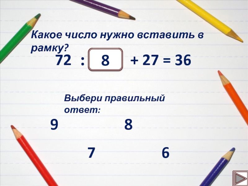 72 :      + 27 = 36 Какое число нужно вставить в рамку?8