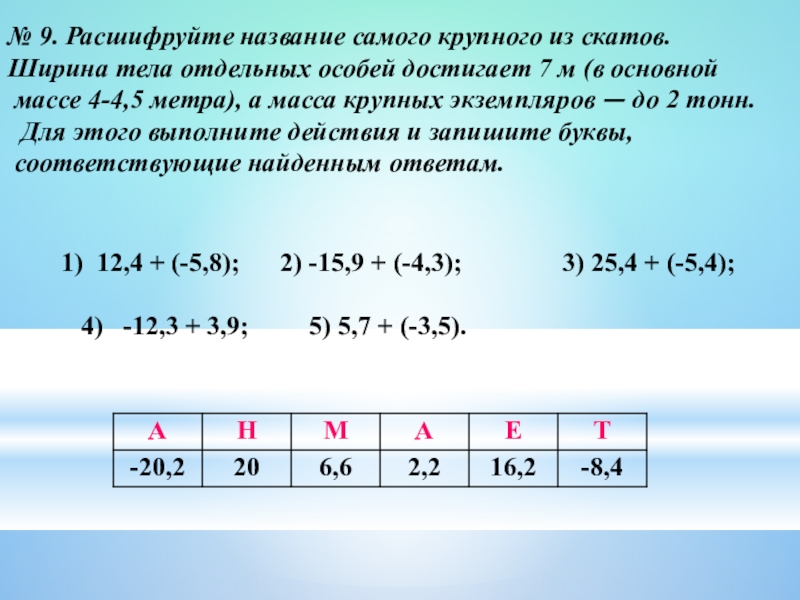 4) -12,3 + 3,9; 5) 5,7 + (-3,5).