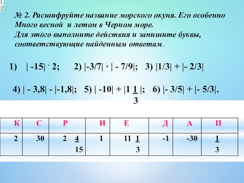 | -15| . 2; 2) |-3/7| ∙ | - 7/9|; 3) |1/3| + |- 2/3|
