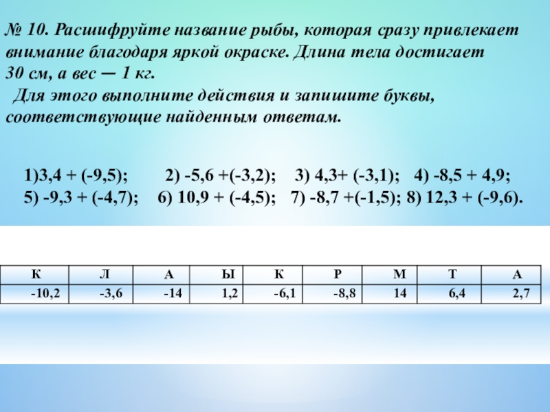 5) -9,3 + (-4,7); 6) 10,9 + (-4,5); 7) -8,7 +(-1,5); 8) 12,3 + (-9,6).