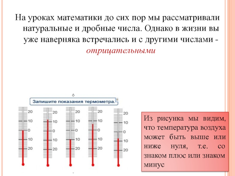 Из рисунка мы видим, что температура воздуха может быть выше или ниже нуля, т.е. со знаком плюс или знаком минус