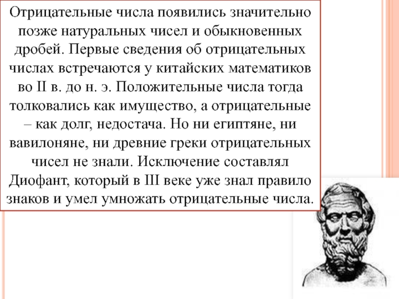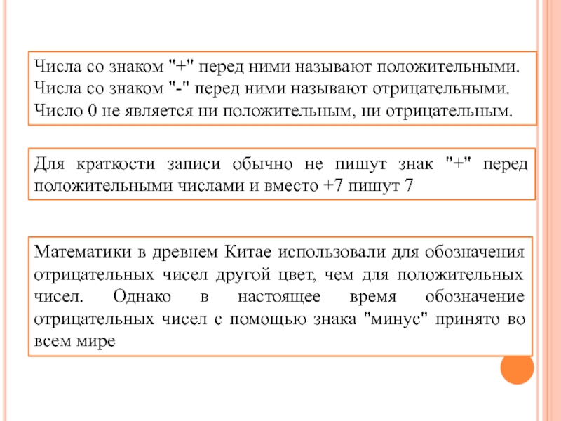 Математики в древнем Китае использовали для обозначения отрицательных чисел другой цвет, чем для положительных чисел. Однако в настоящее время обозначение отрицательных чисел с помощью знака "минус" принято во всем мире