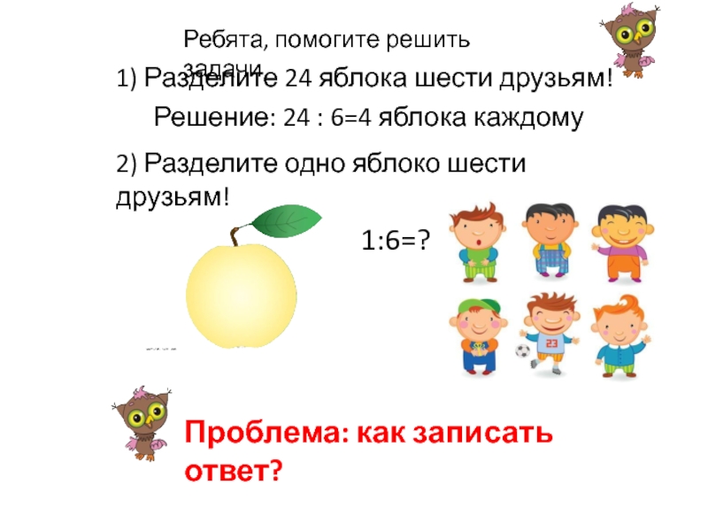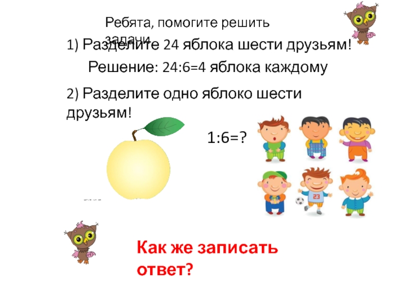 2) Разделите одно яблоко шести друзьям!