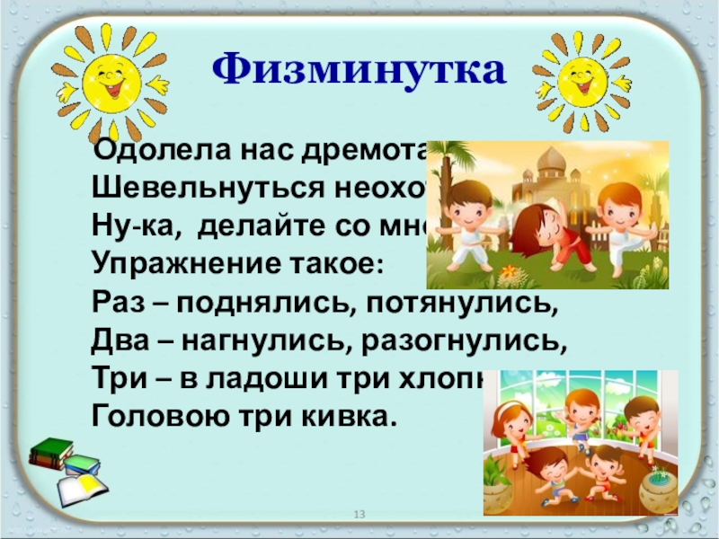 Физминутка    Одолела нас дремота,  Шевельнуться неохота. Ну-ка, делайте со мною  Упражнение такое: