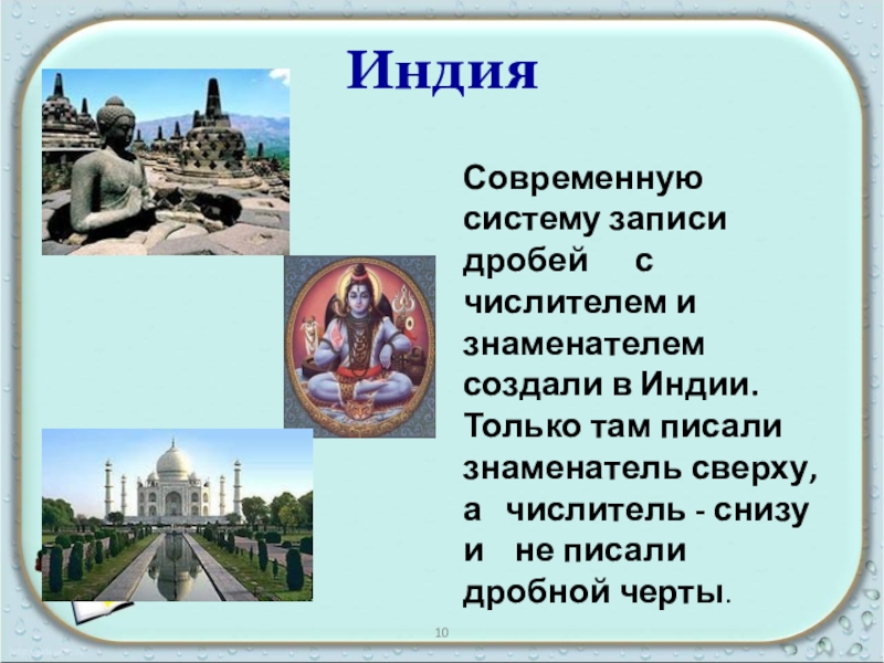 Индия    Современную систему записи  дробей   с числителем и знаменателем создали