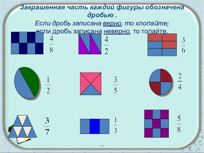 Закрашенная часть каждой фигуры обозначена дробью .  Если дробь записана верно, то хлопайте;   если