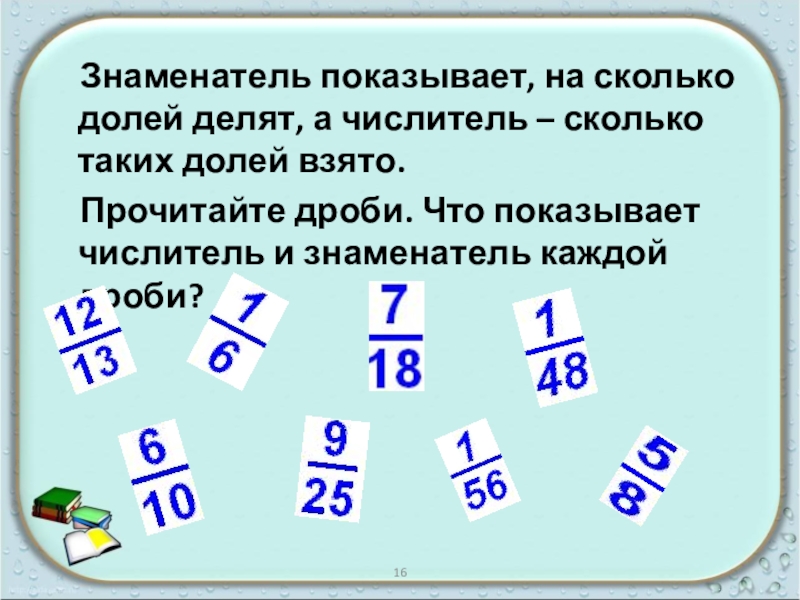 Слайд 16 Знаменатель показывает, на сколько долей делят, а числитель –
