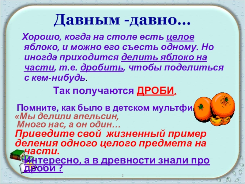 Давным -давно… Хорошо, когда на столе есть целое яблоко, и можно его съесть одному. Но иногда приходится делить яблоко на части, т.е. дробить, чтобы поделиться с кем-нибудь.