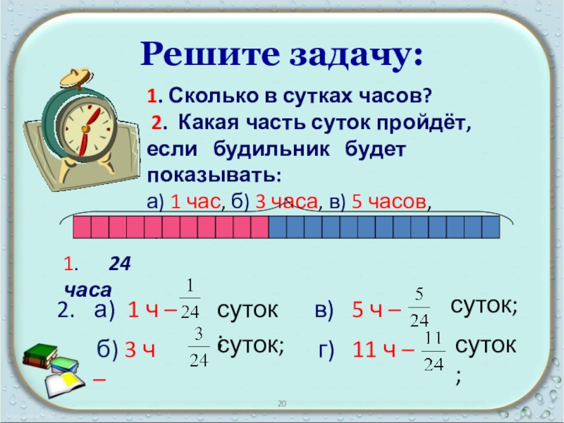 Решите задачу:1. Сколько в сутках часов?  2. Какая часть суток пройдёт, если  будильник  будет