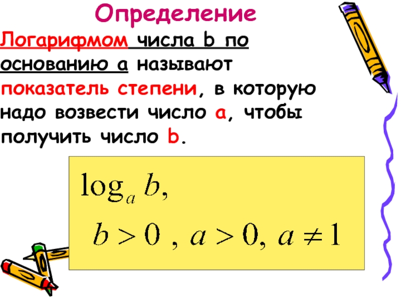 Определение Логарифмом числа b по основанию a называют показатель степени, в которую надо возвести число a, чтобы