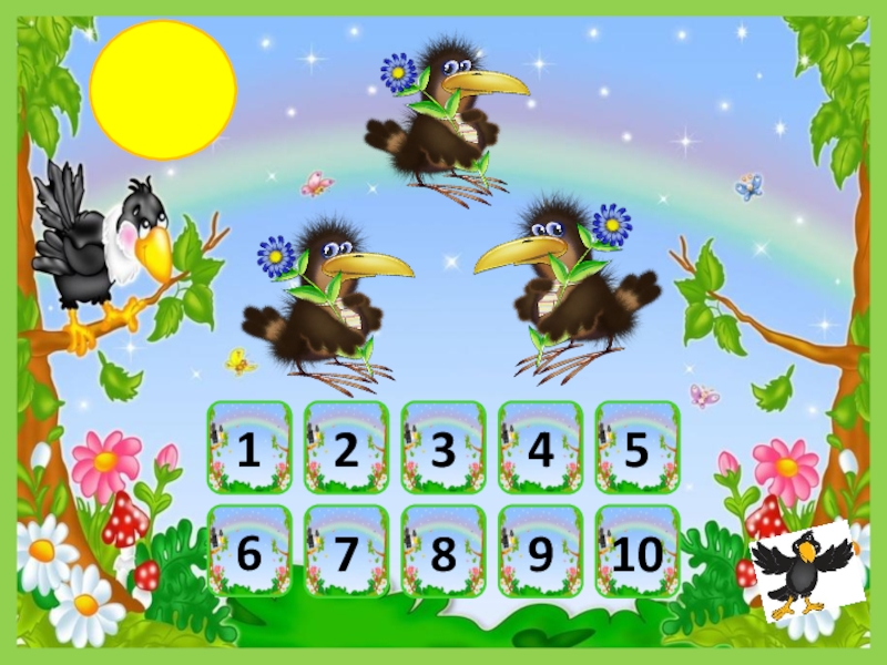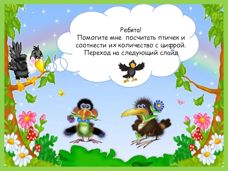 Ребята! Помогите мне посчитать птичек и соотнести их количество с цифрой. Переход на следующий слайд