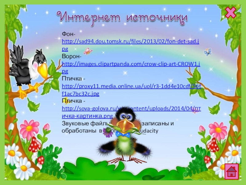 Фон- http://sad94.dou.tomsk.ru/files/2013/02/fon-det-sad.jpgВорон- http://images.clipartpanda.com/crow-clip-art-CROW1.jpgПтичка - http://proxy11.media.online.ua/uol/r3-1dd4e10cdf/56ff1ac7bc32c.jpgПтичка - http://sova-golova.ru/wp-content/uploads/2014/04/птичка-картинка.pngЗвуковые файлы авторские записаны и обработаны в программе Audacity