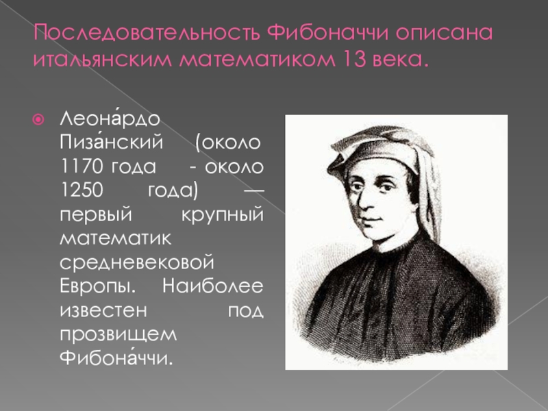 Слайд 3Последовательность Фибоначчи описана итальянским математиком 13 века.