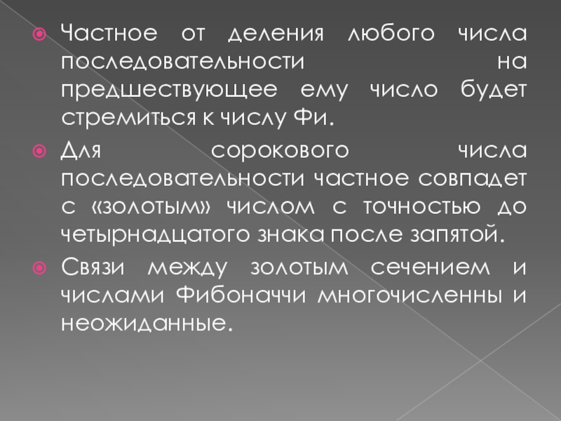 Для сорокового числа последовательности частное совпадет с «золотым» числом с точностью до четырнадцатого знака после запятой.
