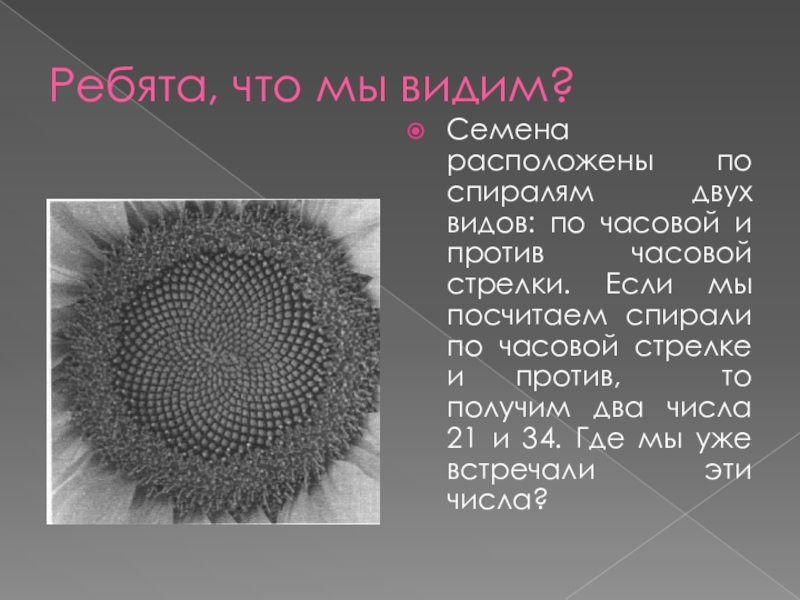 и против часовой стрелки. Если мы посчитаем спирали по часовой стрелке и против, то получим два числа 21 и 34. Где мы уже встречали эти числа?