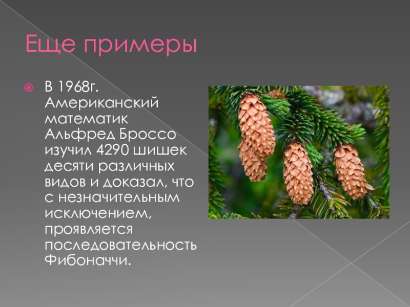 В 1968г. Американский математик Альфред Броссо изучил 4290 шишек десяти