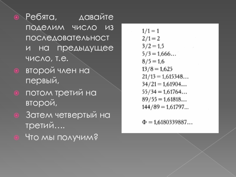 Слайд 6Ребята, давайте поделим число из последовательности на предыдущее число, т.е.