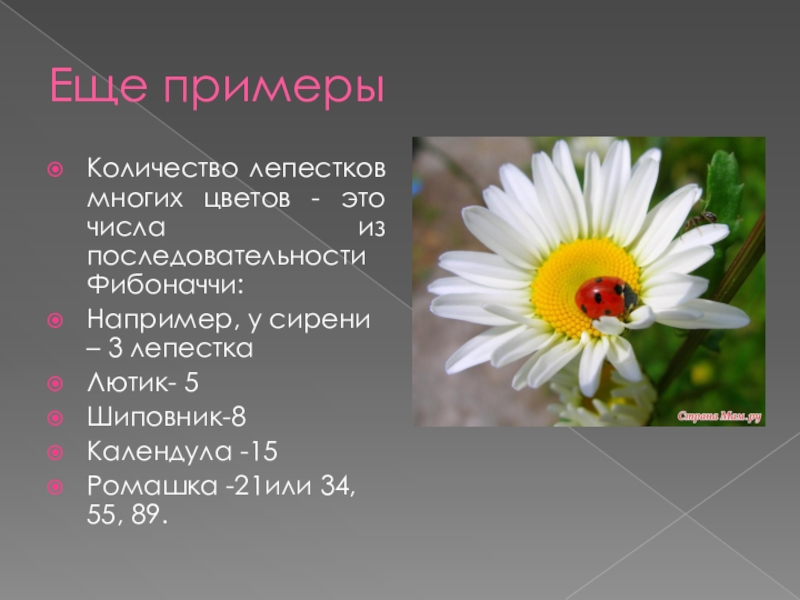Количество лепестков многих цветов - это числа из последовательности Фибоначчи: