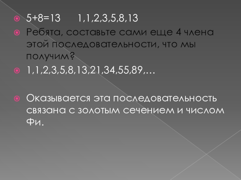 Слайд 55+8=13 1,1,2,3,5,8,13