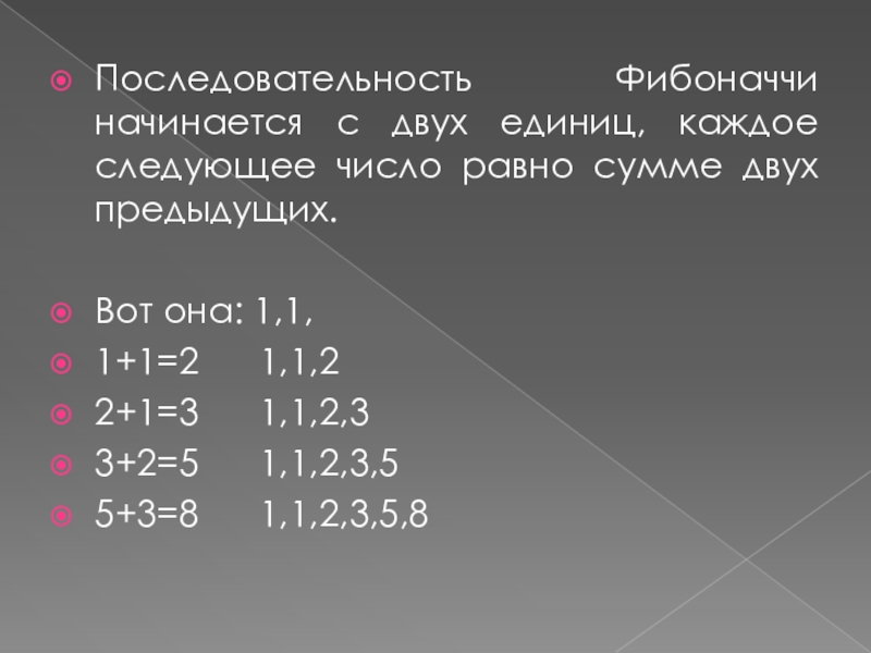 Слайд 4Последовательность Фибоначчи начинается с двух единиц, каждое следующее число равно сумме
