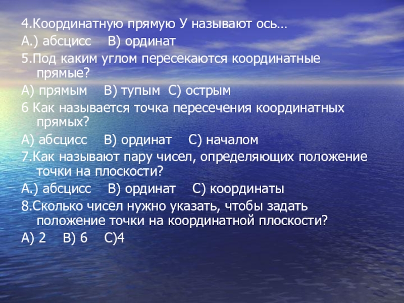 4.Координатную прямую У называют ось…А.) абсцисс  В) ординат5.Под каким углом пересекаются координатные прямые? А) прямым