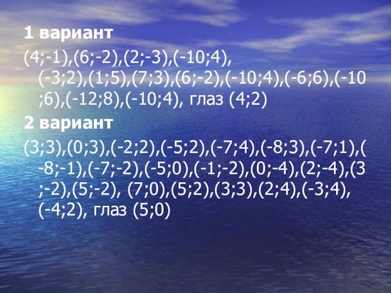 1 вариант(4;-1),(6;-2),(2;-3),(-10;4), (-3;2),(1;5),(7;3),(6;-2),(-10;4),(-6;6),(-10;6),(-12;8),(-10;4), глаз (4;2)2 вариант(3;3),(0;3),(-2;2),(-5;2),(-7;4),(-8;3),(-7;1),(-8;-1),(-7;-2),(-5;0),(-1;-2),(0;-4),(2;-4),(3;-2),(5;-2), (7;0),(5;2),(3;3),(2;4),(-3;4), (-4;2), глаз (5;0)