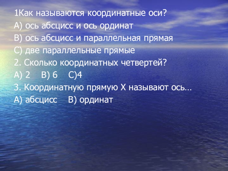 1Как называются координатные оси? А) ось абсцисс и ось ординатВ) ось абсцисс и параллельная прямаяС) две параллельные