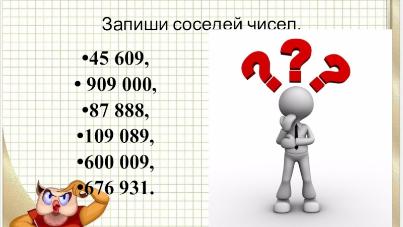 Запиши соседей чисел. 45 609, 909 000, 87 888, 109 089, 600 009, 676 931.