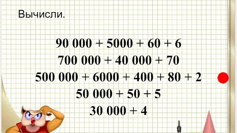 Вычисли. 90 000 + 5000 + 60 + 6 700 000 + 40 000 + 70 500 000 + 6000 + 400 + 80