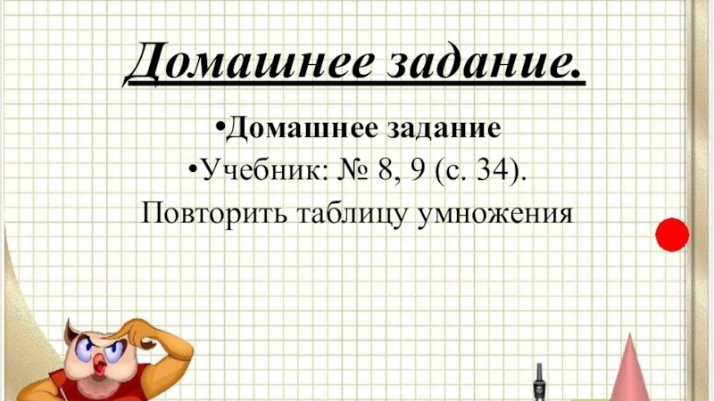 Домашнее задание.Домашнее заданиеУчебник: № 8, 9 (с. 34).Повторить таблицу умножения