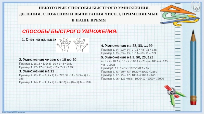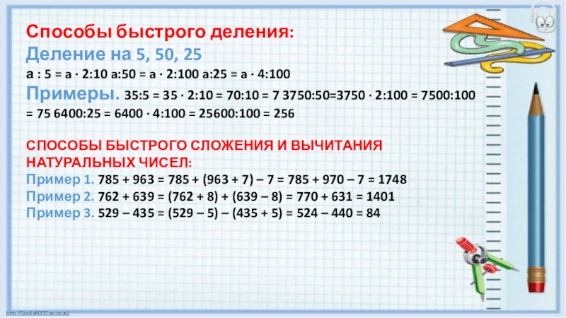 Пример 3. 27 ∙ 25 = 27 ∙ 100:4=2700:4 = 675