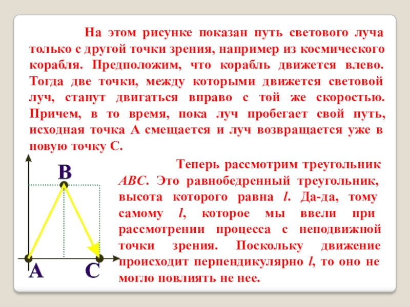 Теперь рассмотрим треугольник ABC. Это равнобедренный треугольник, высота которого равна l. Да-да, тому самому l, которое мы ввели при рассмотрении процесса с неподвижной точки зрения. Поскольку движение происходит перпендикулярно l, то оно не могло повлиять не нее.