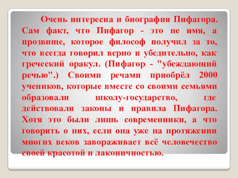 Пифагор - это не имя, а прозвище, которое философ получил за то, что всегда говорил верно и убедительно, как греческий оракул. (Пифагор - "убеждающий речью".) Своими речами приобрёл 2000 учеников, которые вместе со своими семьями образовали школу-государство, где действовали законы и правила Пифагора. Хотя это были лишь современники, а что говорить о них, если она уже на протяжении многих веков завораживает всё человечество своей красотой и лаконичностью.