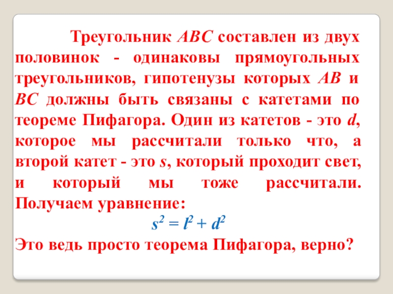 - одинаковы прямоугольных треугольников, гипотенузы которых AB и BC должны быть связаны с катетами по теореме Пифагора. Один из катетов - это d, которое мы рассчитали только что, а второй катет - это s, который проходит свет, и который мы тоже рассчитали.