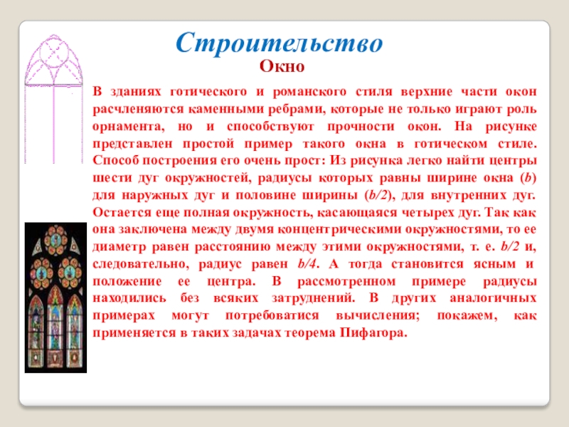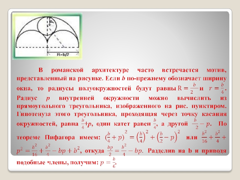 ребрами, которые не только играют роль орнамента, но и способствуют прочности окон. На рисунке представлен простой пример такого окна в готическом стиле. Способ построения его очень прост: Из рисунка легко найти центры шести дуг окружностей, радиусы которых равны ширине окна (b) для наружных дуг и половине ширины (b/2), для внутренних дуг. Остается еще полная окружность, касающаяся четырех дуг. Так как она заключена между двумя концентрическими окружностями, то ее диаметр равен расстоянию между этими окружностями, т. е. b/2 и, следовательно, радиус равен b/4. А тогда становится ясным и положение ее центра. В рассмотренном примере радиусы находились без всяких затруднений. В других аналогичных примерах могут потребоватися вычисления; покажем, как применяется в таких задачах теорема Пифагора.