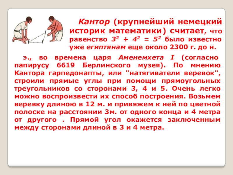 э., во времена царя Аменемхета I (согласно папирусу 6619 Берлинского музея). По мнению Кантора гарпедонапты, или "натягиватели веревок", строили прямые углы при помощи прямоугольных треугольников со сторонами 3, 4 и 5. Очень легко можно воспроизвести их способ построения. Возьмем веревку длиною в 12 м. и привяжем к ней по цветной полоске на расстоянии 3м. от одного конца и 4 метра от другого . Прямой угол окажется заключенным между сторонами длиной в 3 и 4 метра.