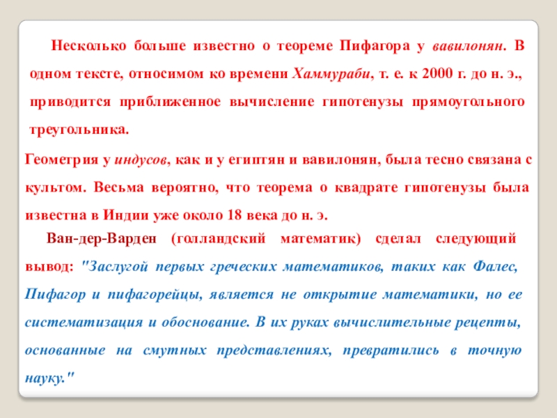 Слайд 12Несколько больше известно о теореме Пифагора у вавилонян. В одном тексте,