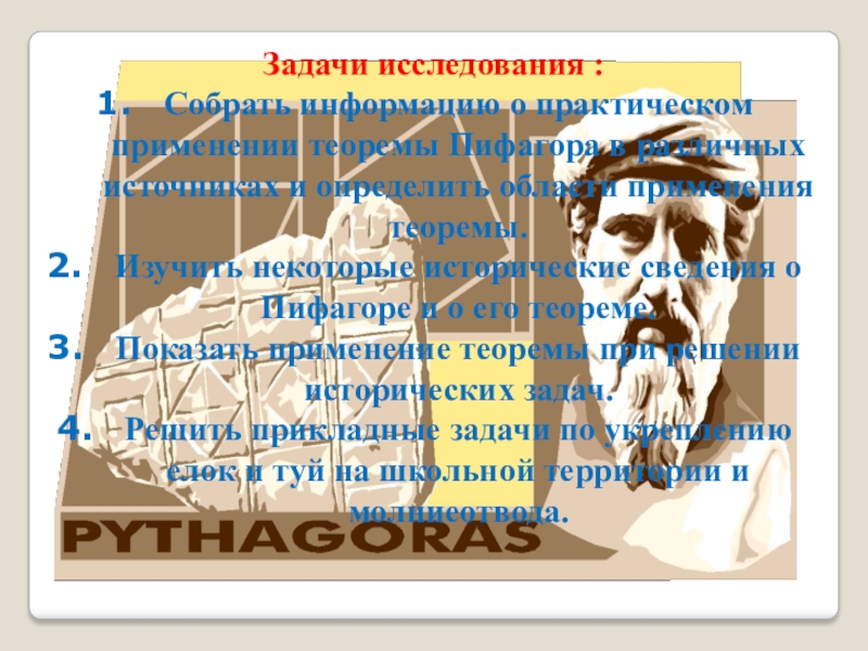 Изучить некоторые исторические сведения о Пифагоре и о его теореме.