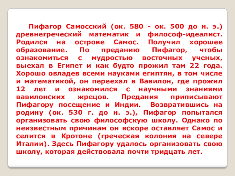 древнегреческий математик и философ-идеалист. Родился на острове Самос. Получил хорошее образование. По преданию Пифагор, чтобы ознакомиться с мудростью восточных ученых, выехал в Египет и как будто прожил там 22 года. Хорошо овладев всеми науками египтян, в том числе и математикой, он переехал в Вавилон, где прожил 12 лет и ознакомился с научными знаниями вавилонских жрецов. Предания приписывают Пифагору посещение и Индии. Возвратившись на родину (ок. 530 г. до н. э.), Пифагор попытался организовать свою философскую школу. Однако по неизвестным причинам он вскоре оставляет Самос и селится в Кротоне (греческая колония на севере Италии). Здесь Пифагору удалось организовать свою школу, которая действовала почти тридцать лет.