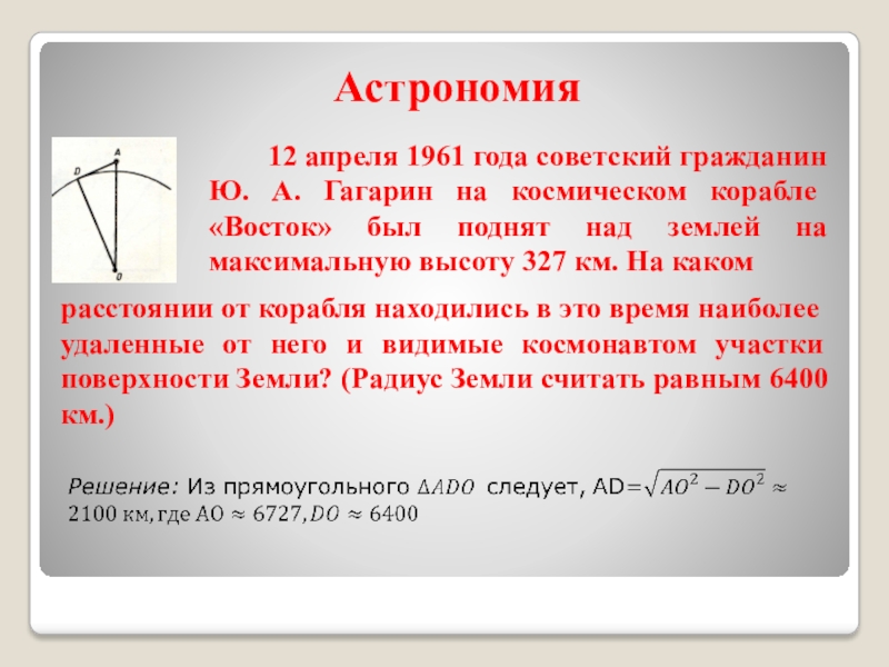 расстоянии от корабля находились в это время наиболее удаленные от него и видимые космонавтом участки поверхности Земли? (Радиус Земли считать равным 6400 км.)