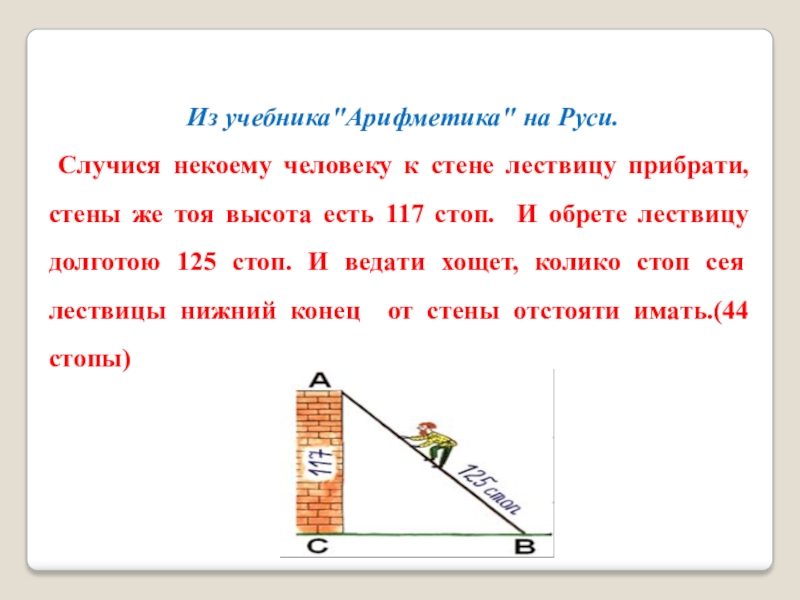 лествицу прибрати, стены же тоя высота есть 117 стоп. И обрете лествицу долготою 125 стоп. И ведати хощет, колико стоп сея лествицы нижний конец от стены отстояти имать.(44 стопы)