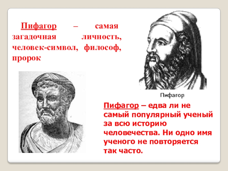 Слайд 8Пифагор – самая загадочная личность, человек-символ, философ, пророк