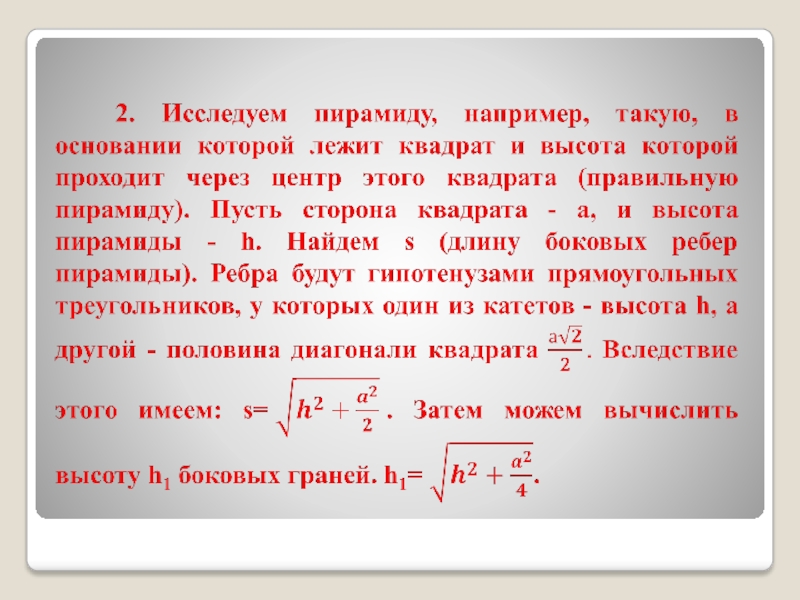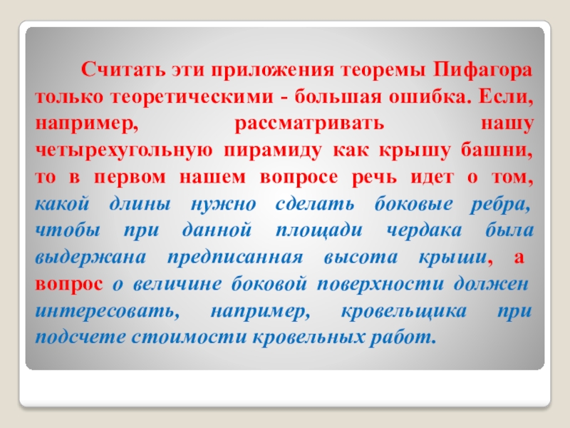 - большая ошибка. Если, например, рассматривать нашу четырехугольную пирамиду как крышу башни, то в первом нашем вопросе речь идет о том, какой длины нужно сделать боковые ребра, чтобы при данной площади чердака была выдержана предписанная высота крыши, а вопрос о величине боковой поверхности должен интересовать, например, кровельщика при подсчете стоимости кровельных работ.