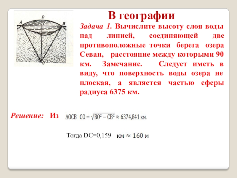 точки берега озера Севан, расстояние между которыми 90 км. Замечание. Следует иметь в виду, что поверхность воды озера не плоская, а является частью сферы радиуса 6375 км.